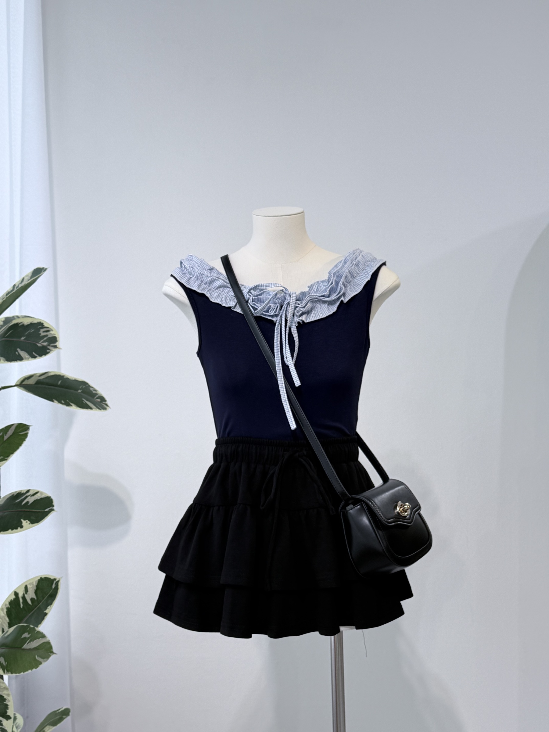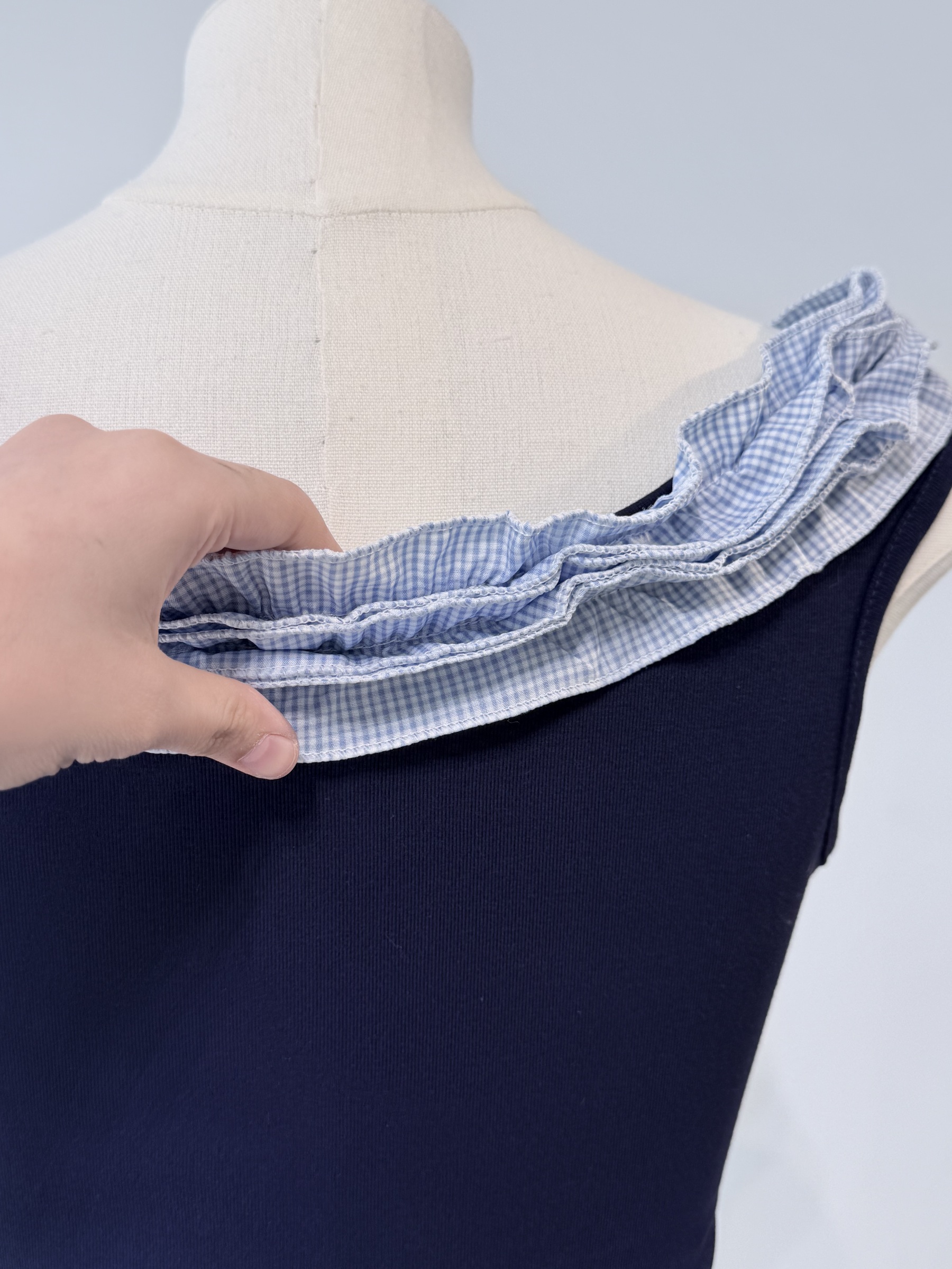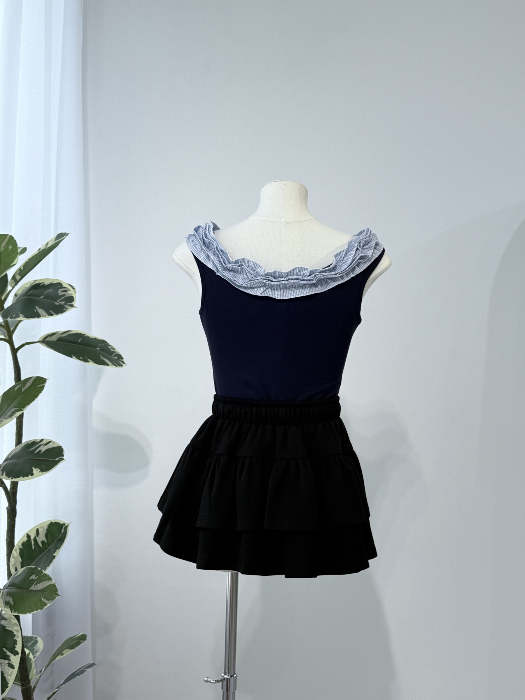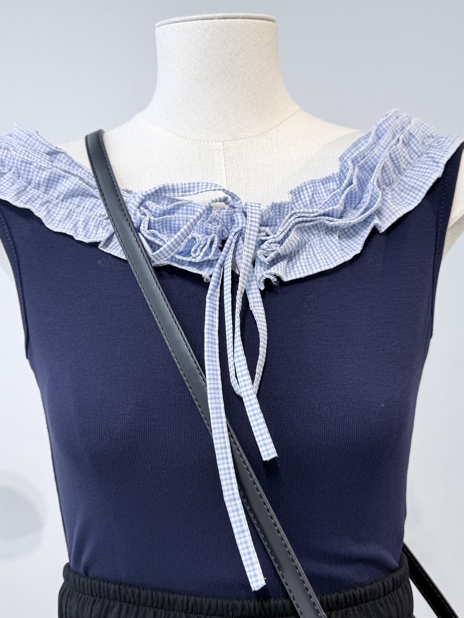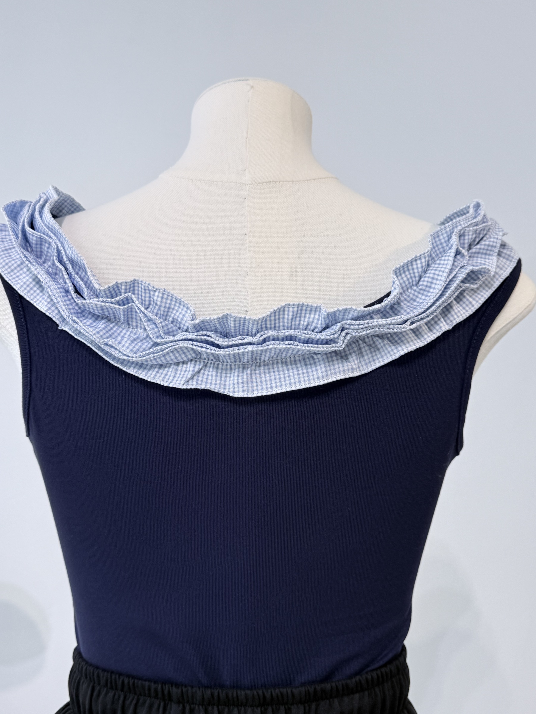 Navy Tie Front Top 荷叶边一字领上衣